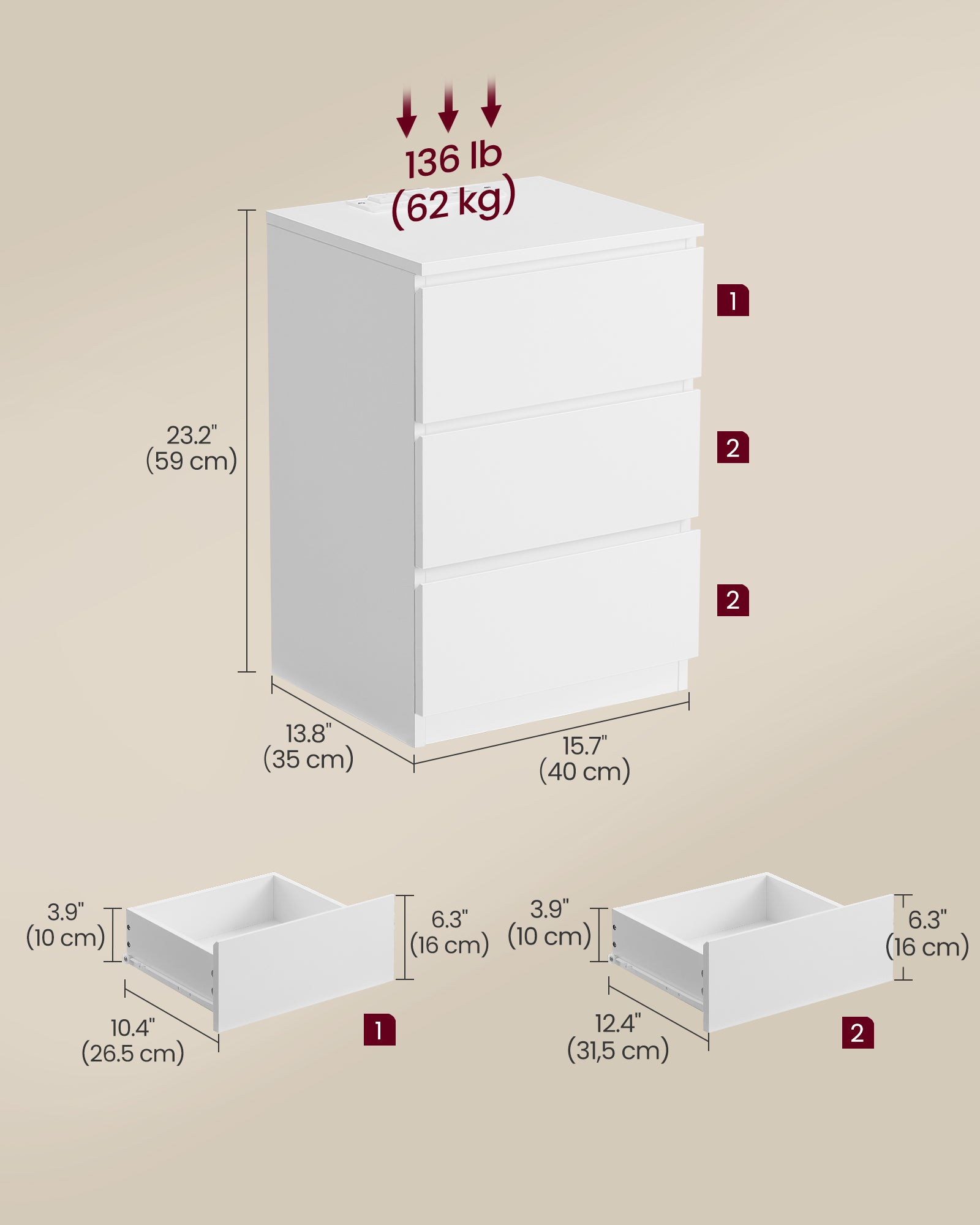 Nightstand with Charging Station - 3 Drawers, 136 lb Capacity