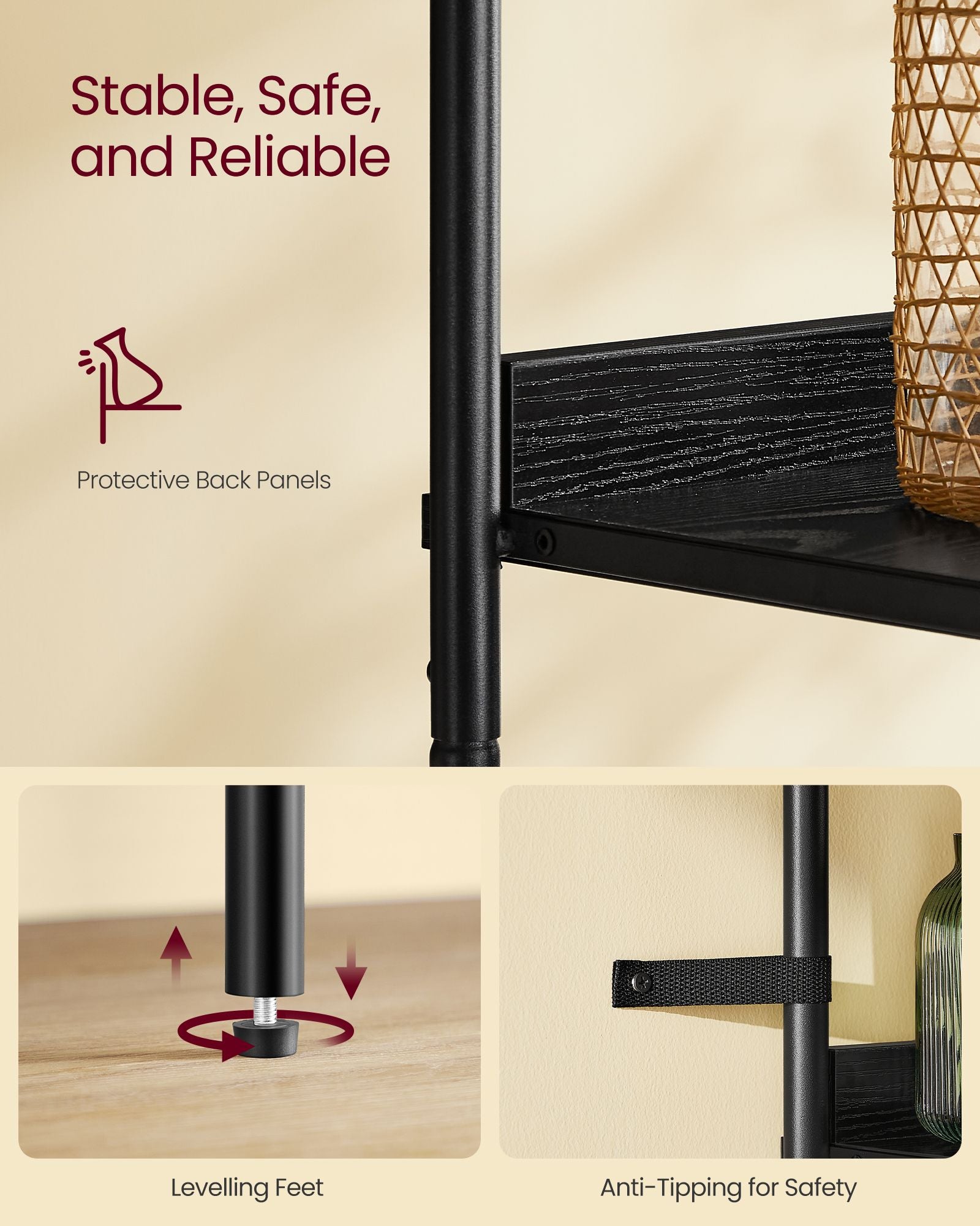 Equipped with adjustable feet to ensure a level stance on uneven floors and an anti-tip kit for added safety. Back panels help prevent items from sliding off the shelves.