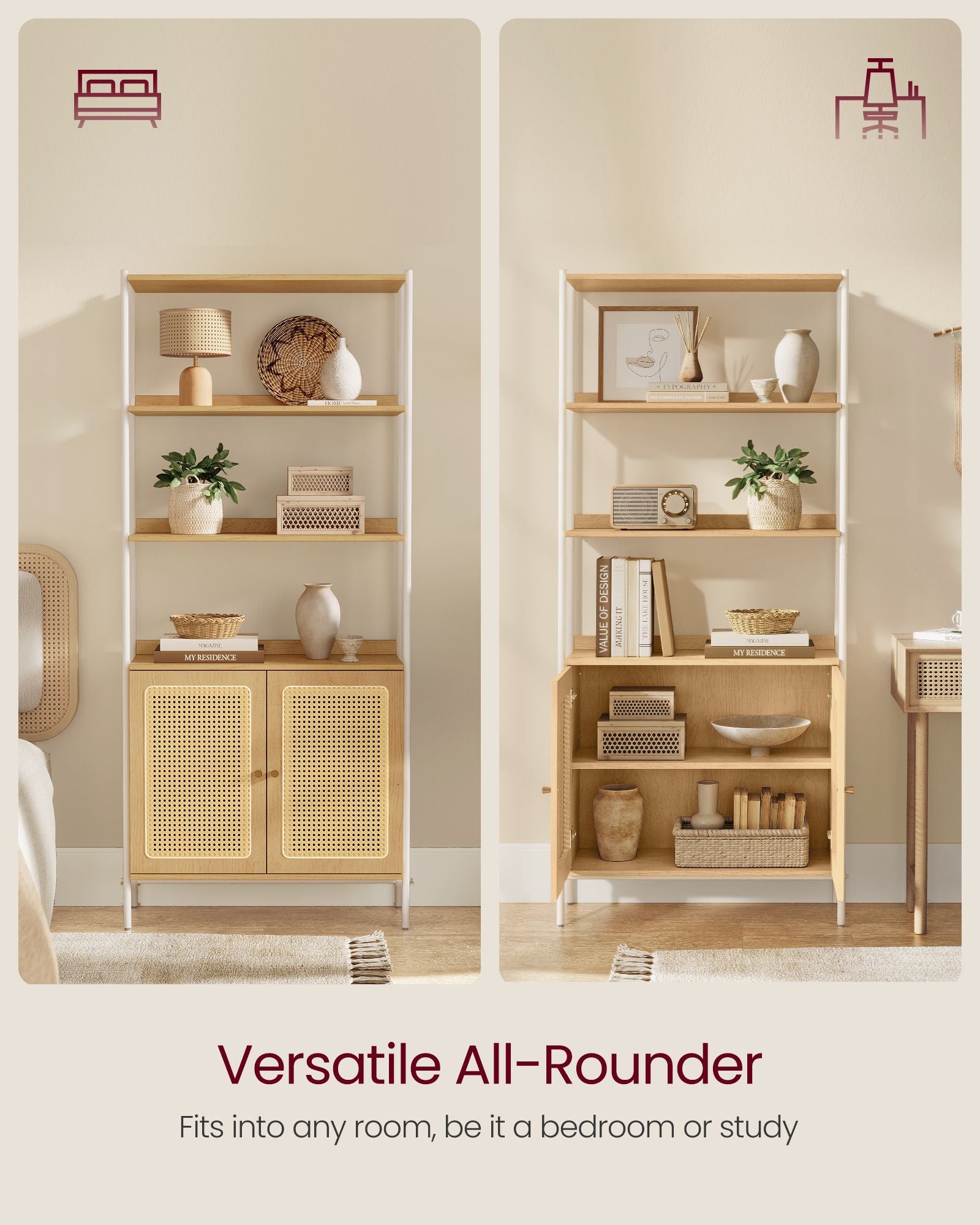 Blending modern structure with rattan-style cabinet accents, this tall bookshelf brings a relaxed, lived-in vibe to any room—perfect for boho, contemporary, or eclectic interiors.