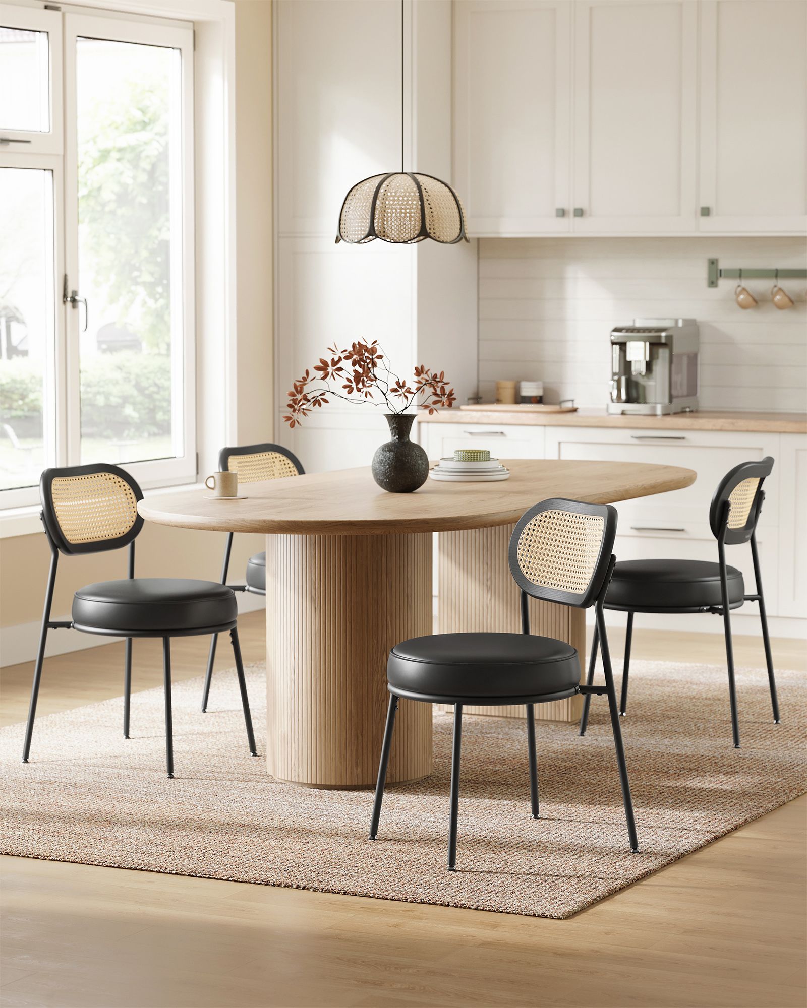 Set of 2 BOHO Dining Chairs - Rattan Backrest & Faux Leather Cushion