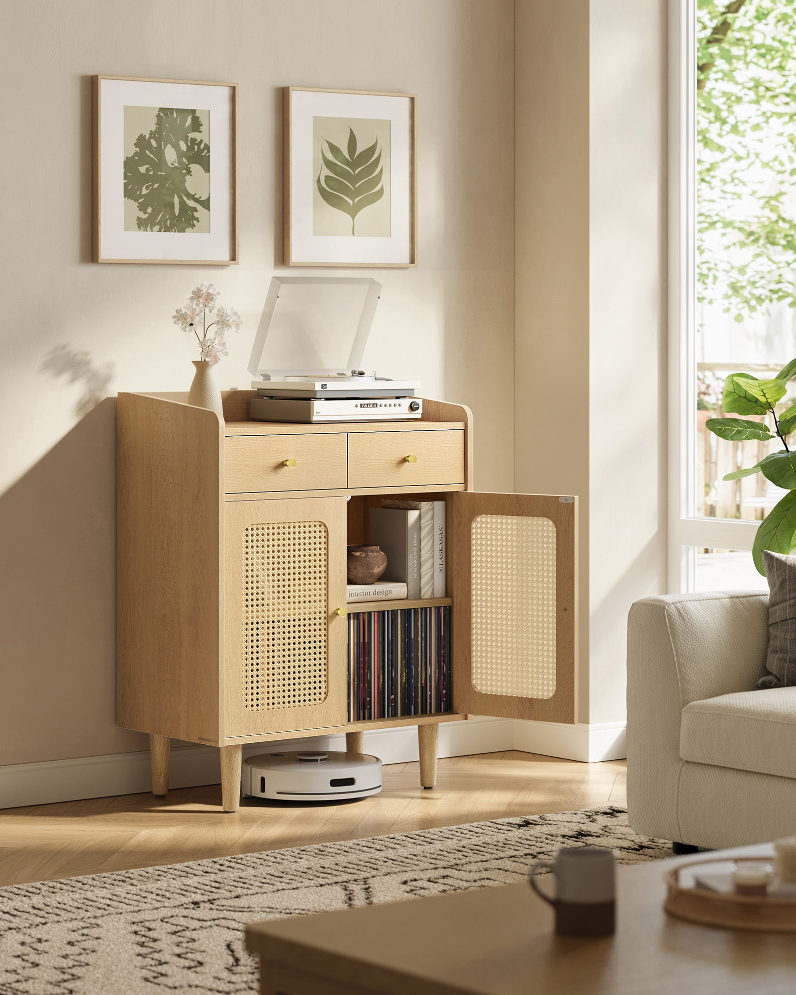 Bohemian Design and Practicality: Part of the BOHOVEN Collection, this buffet cabinet blends natural tones, a woven texture, and solid wood legs to bring a boho-inspired style to your space.